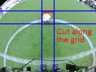 320x240の入力画像を40x40に切り取りそれぞれのクラスを推論しボールが写っている画像の箇所をボールの位置をするようになっています。